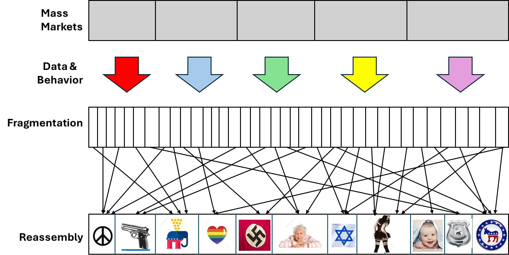 The ad tech plumbing, along with data collected principally by Google / Meta / Amazon / Apple and platforms like Epsilon and Acxiom allow large consumer markets to be disassembled and then reassembled into homogeneous ‘bubbles’ for marketing (and political communications) purposes.